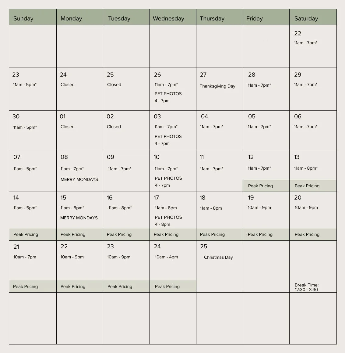 Your reservation time is an estimate. Peaks of service, and the unique experience of every visitor can affect this. Please arrive no earlier than 5 minutes before your quoted reservation time.